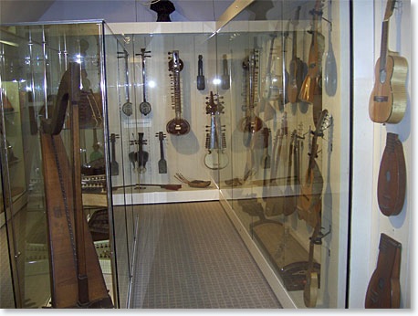 Tafelklavier, keltisch-nordische Lure (Nachbau), Lyragitarre von ca. 1810, Wurlitzer-Orgel von 1964, ferner ein Modell des Musikhauses Hieber
